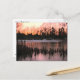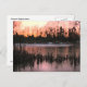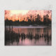 This artistic postcard displays an abstract, impressionistic interpretation of sunset over a pond. Most of the winter ice has melted to reflect the lovely colors of orange, salmon, yellow, purple and gold. The surrounding trees are in black silhouette.