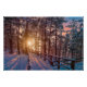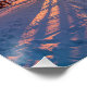 Sunset in snowy pine forest with sun ray poster