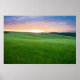 Poster print of a landscape with the rolling fields with green wheats at sunset in the Val d'Orcia valley in Tuscany, Italy. Great summer decoration on your wall!