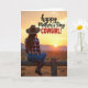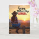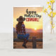 This card shows a lone woman seen from behind, sitting on a weathered wooden fence and looking out toward a wide, open horizon, as if she’s quietly sharing the view with someone she cares about ❤️. She wears a wide-brim hat, a red-and-white plaid shirt, denim pants, and tall boots that catch a bit of the warm light. The sky is washed in golden tones—ochre, soft orange, and hazy yellow—suggesting either early morning or late evening. A round sun hangs just above distant dark hills, and the glow outlines her figure and brings out the auburn color in her hair as it falls down her back. The fence posts show rough texture and age, adding a grounded, country feel that pairs nicely with the calm mood. Across the upper area, a flowing line of text sits over the sky, with a larger, heavier line of lettering beneath it, both in a light cream color that stands out against the warm background 🌼. The hills form a low, dark silhouette while the bright sun remains centered near the horizon line.