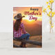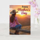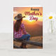 This card shows a lone person seen from behind, sitting on a weathered wooden fence and looking out at a glowing sunset, with a calm, caring mood in the scene ❤️. The figure wears a wide-brim hat in a soft neutral shade, a pink-and-white checkered shirt, blue trousers, and brown boots, all lit by the low sun. Their long reddish-brown hair catches the light, giving it a gentle shine as if the evening is brushing it with gold. The sky spreads in layered oranges, warm yellows, and deep amber tones, and the sun sits near the horizon above dark, rolling hills in the distance. The rough grain and uneven edges of the fence add earthy detail up front, like a steady place to pause and think of someone you love 🌼. Near the upper right, the words “happy Mother’s Day” appear in a flowing style, set in a light color that stands out softly against the warm sky. The distant hills form a dark silhouette while the sun glows as a bright orb against the orange-and-gold horizon.