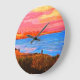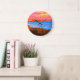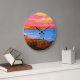 This wall clock contains a stylized image of a coastal sunset in Santa Cruz, California in hues of pink, purple, orange, and blue.