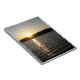 The sun rests on a low, silhouetted mountain range in Pittsfield, Massachusetts. The sky transitions from yellow to orange to blue. Onota Lake fills the bottom half of the photograph. Ripples cover its surface and break up the golden reflection of the sunset.