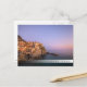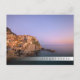Photo postcard of the purple sky at sunset over the lovely village Manarola, built on the rocks above the Mediterranean Sea at the coast of the Cinque Terre area in Liguria, Italy with a fading white bar and the text 'Cinque Terre'.
