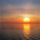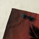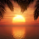 A Sunset over the ocean with palm tree leaves in the foreground, the sun is a bright yellow and orange, the sky is a mix of orange and red.