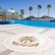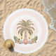 Watercolor palm tree with shell and hibiscus crest with initials. Original Illustration by Becky Nimoy