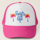 Sunset palm trees trucker hat with the phrase "Surf's Up".
