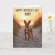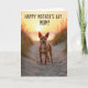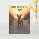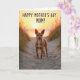 This card shows a small, alert dog with warm fawn-colored fur standing on a winding sandy path at twilight, looking out with gentle curiosity that feels like a quiet bond ❤️. Soft golden light from a low sun washes over the scene, with warm highlights on the dog’s coat and a faint orange blush across the rippled sand. The path leads toward a calm stretch of water where the sun sits near the horizon, turning the sky into layers of amber and pale peach. Wisps of dune grass frame the view on both sides, their thin blades dark against the glow as if they’re leaning in to witness the moment. The overall setting feels like a peaceful seaside walk shared with someone close, where the dog’s steady stance suggests loyal companionship 🌼. Across the top, the message “HAPPY MOTHER’S DAY MOM!” is placed in large, friendly lettering, standing out clearly against the bright sky. The text appears centered near the upper edge, leaving the dog and sunset unobstructed below. Near the horizon, the sun forms a soft amber circle reflected in a narrow, shimmering streak on the water.