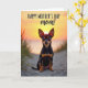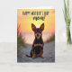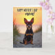 Designed with a serene beach scene, this card centers on a small companion animal with black-and-tan markings sitting on pale sand and gazing forward with wide, glowing eyes and a gentle, almost smiling mouth ❤️. Its upright ears catch the last light of day, creating a soft halo along their edges as if the sunset is leaning in close. Behind it, the sky shifts through warm orange and golden tones that fade into a lighter yellow near the horizon, giving the moment a tender, affectionate feel. Fine grains of sand and a few tufts of dune grass frame the foreground, adding texture like a quiet embrace around the subject 🌼. In the distance, calm water mirrors the fading light, stretching the scene into a peaceful backdrop. Near the top of the design, a celebratory message appears in thick, flowing lettering, set in a dark color that stands out against the bright sky. The text sits above the animal’s head without covering its face, keeping the eye contact front and center. A thin rim of warm light outlines the animal’s silhouette against the glowing sunset.