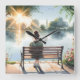This serene artwork captures a quiet moment of solitude and reflection as a young woman sits peacefully on a wooden bench, gazing out over a calm lake bathed in golden sunset light. Surrounded by lush trees and blooming wildflowers, the scene evokes a tranquil cottagecore charm, blending soft watercolor textures with gentle lighting. Warm hues of amber and pastel greens complement the dreamy glow of the setting sun, while delicate shadows stretch across the water’s surface. The composition invites viewers into a world of quiet contemplation, wrapped in nature’s embrace. AI generated artwork.