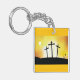 Carry a meaningful reminder of faith and reflection wherever you go with this stunning keychain. The design features a silhouette of three crosses atop a hill, illuminated by the warm, golden hues of a sunset. This powerful image symbolizes hope, redemption, and spiritual strength, making it a perfect accessory for those who cherish their faith.