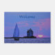 Welcome folks into safe harbor, when one is sailing by for a visit. Scenic sunset sailboat and lighthouse featured on sturdy welcome door mat.