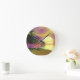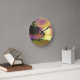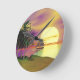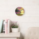 Wall clock with my artwork of a peaceful tropical scene with a sailboat sailing past an island and a setting sun.