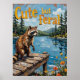 This unique painting features a raccoon as a solitary figure on a wooden pier, with its gaze directed at the tranquil lake. The background is a beautiful sunset, with rich oranges and yellows blending with the blue water. The thick, textured brushstrokes give the scene a dreamlike quality. The phrase "Cute but feral" is prominently written in a distinctive font, highlighting the animal's dual nature against the peaceful landscape.