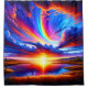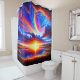 This shower curtain has a colorful sunset pictured on it.