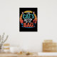 This graphic presents a striking black silhouette of a cat's head, set against a vibrant retro-style sunset gradient in yellow, orange, and blue hues. The bold text, "THE CAT'S OUT OF THE BAG," is prominently displayed within the cat's silhouette, with the word "CAT'S" and "BAG" in a contrasting teal. A playful curly tail accents the design, emphasizing the humorous idiom. Digital download for personal use only.