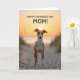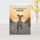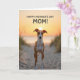 This card features a slender, graceful dog standing centered on a sandy path, facing forward with bright, attentive eyes that feel like a gentle greeting ❤️. Behind the dog, a low sun sits almost directly above its head, casting warm golden light across the dunes and giving the scene a tender, affectionate glow. The background shows calm water meeting the horizon, with soft oranges and yellows fading into cooler tones higher in the sky. Wispy grasses on both sides lean inward as if framing the dog like caring arms, adding a quiet sense of closeness. Near the top of the design, the message “HAPPY MOTHER’S DAY MOM!” is placed in large, easy-to-read letters that stand out clearly against the sky. The text appears in a dark color, centered above the dog so it feels like the words are being delivered straight from the scene. Subtle ripples of sand in the foreground create depth and a calm, unhurried mood, with a small 🌼 touch of softness in the overall look. The dog’s fawn-and-white coat is highlighted along the chest and legs, while the sandy path leads back toward the glowing sun and the waterline.