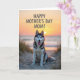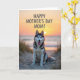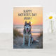 This card shows a large black-and-white dog with striking blue eyes sitting neatly on a sandy path, looking up with a tender, friendly gaze ❤️. Its mouth is slightly open as if mid-pant, and the soft light catches along the edges of its fur like a gentle outline. Behind it, low dunes roll away with scattered tufts of pale grass, giving the scene a quiet, intimate feel like a shared walk. Farther back, calm water stretches toward the horizon where the sun is dropping, tinting the sky with orange, peach, and pink. The warm dusk colors make the dog’s expression feel even more affectionate, as if it’s keeping someone close with its steady attention. A short Mother’s Day greeting sits over the image, placed near the upper area in light-colored lettering that stands out against the sunset tones 🌼. Fine ripples in the sand lead the eye toward the shoreline, while the distant sun glows just above the waterline.