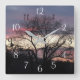This lovely wall clock shows a photograph of a layered and beautifully colored sunset as seen through the silhouette of an oak tree.