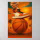 An eye-catching orange and white sneaker balanced on a basketball, set against a vibrant sunset backdrop with palm trees and clouds. This image captures the essence of laid-back, tropical street style with a sporty twist.