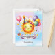Make their day brighter with our Sunshine Custom Name Happy Birthday Postcard featuring a smiling sunshine wearing a birthday party hat surrounded by decorations, balloons, stars, and pure joy and fun!