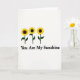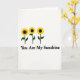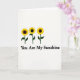 Designed with three sun-gazing blooms arranged in a neat horizontal row near the upper middle, this card keeps the background a wide, open white so the flowers feel like they’re leaning in together like close friends ❤️. Each flower has bright yellow, slightly jagged petals circling a deep, nearly black round center, creating a strong contrast that draws your eye. Slim, dark green stems rise upward with a single curved leaf on each, adding a gentle, natural rhythm. The closeness and matching tilt of the blooms suggests a tender togetherness, like shared warmth on an ordinary day. Centered directly below the flowers, the phrase “You Are My Sunshine” appears in solid black lettering that stands out crisply on the white space. The simple layout leaves plenty of breathing room around the message, letting the words feel calm and direct 🌼. The yellow petals glow against the white field while the dark centers anchor the design, and the green stems form three clean vertical lines beneath the blossoms. The text sits just under the stems, centered on the page, with the black letters evenly spaced and easy to read.