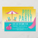 Abundant sunshine and a pink flamingo pool float? Yes, please! Get ready to dive in for some fun with this adorable pool party invitation. Bright summer colors and a retro vibe really make it pop. Picture yourself sipping a drink in a cabana chair, under a pink striped umbrella, while the kids splash around in the bright turquoise water. Bring on summer!