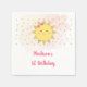 These cute birthday napkins feature a sweet sunshine with a pink watercolor background and faux gold foil lettering and confetti dots.