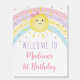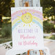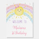 Welcome your party guests with an adorable personalized sign. The design features a sunshine with a pastel colored rainbow and faux gold glitter confetti.