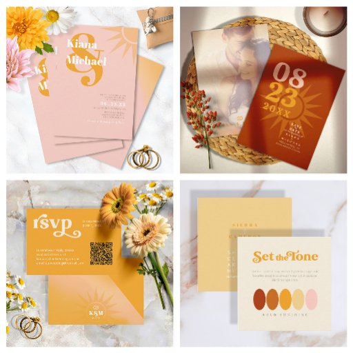 This fun wedding RSVP card is part of a vibrant wedding suite featuring a color palette as bright as a sunny day, ranging from brick red to peach pink and marigold. The colorful design is complemented by bold typography in a modern, retro-inspired style, making it the perfect choice for couples looking to add a touch of sunshine to their special day. Search ID1048 to see other pieces and color choices for this set.