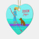 Custom stand up paddle-boarding ornament for daughter or friend. Illustrated design in tropical colors is printed on both sides of a heart-shaped ornament. A young girl paddles on a purple board with her dog. Personalize with year date and her name. Text will also be printed on both sides. This shape only.