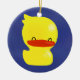 A cheerful and smiling yellow rubber ducky against a blue background round ornament.