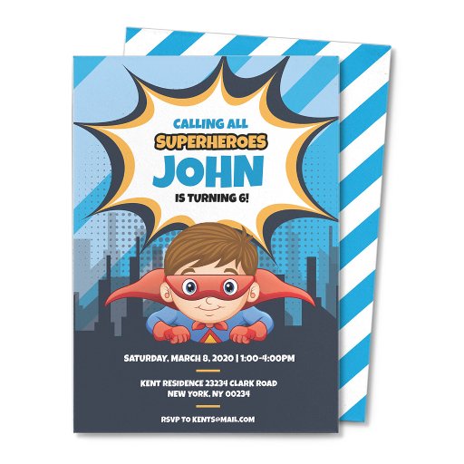 Plain white envelopes are included with paper invitations and will come to fit the invitation size you select. If you don’t need the envelopes, you may choose to not receive them by selecting the dropdown below "Envelopes" and choosing "None." If you’d like to have a design on your envelopes, you can browse all of these available envelopes to find the design that complements your Superhero Brown Hair Party Invitation 5x7.