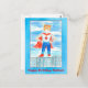 A fun postcard to wish a young boy a happy birthday decorated with a superhero dressed in a red, white and blue costume with mask standing tall! Illustrated with watercolor.