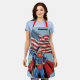 Great color and even though I ordered the kid size, it covers well enough to use during the holidays. I am not a big woman and prefer a shorter apron. I stand 5"6" and the length of the garment goes to mid-thigh. The tie straps fit well at my waist and even though there is no neck strap adjustment, the opening is plenty big enough. I am happy with the size and fit. I am sharing my apron with my 10 year old grandson, too! The color is vibrant and looks good, as shown on the website. The stitching looks strong and reinforced. Photographed is front side and back side of the apron, reinforced straps and coloring. My phone camera may not be the best at showing the details.