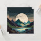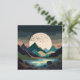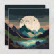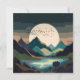 An abstract landscape of a massive supermoon in a mountain lake scene with a flock of birds in bold textures and dark earthy tones of brown, beige, tan, blue, cyan, and black.