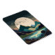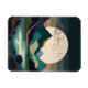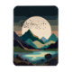 An abstract landscape of a massive supermoon in a mountain lake scene with a flock of birds in bold textures and dark earthy tones of brown, beige, tan, blue, cyan, and black.