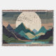 An abstract landscape of a massive supermoon in a mountain lake scene with a flock of birds in bold textures and dark earthy tones of brown, beige, tan, blue, cyan, and black.