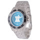 Has heft and feel of expensive stainless steel quartz watches. Good band with safety catch. I removed links, which is easy because engraved arrows show direction to push the linking pins. As always by this seller, the image (a railroad logo) is a perfect reproduction of my emailed image, and is precisely spaced and aligned.
