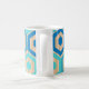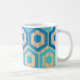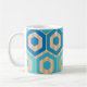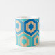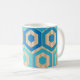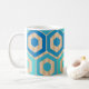 This mug has a geometric design of hexagons in four shades of blue on a field of tan stripes in two shades.