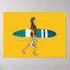 A poster of a surf girl in a red swimsuit with a longboard and a beach clean bag