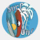 The design on these Round Stickers is two surf boards standing in the sand in front of two palm trees on a two tone star burst background. One surf board has a red design of a silhouetted woman on a white circle background. The other board is a blue abstract design of the sun setting behind waves.