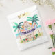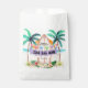 Cute beach theme birthday favor bags feature a tropical paradise with sun, sea, palm trees and a surfboard adorned with a "The Big One" banner, string lights, hibiscus and palm leaves. The colors are gender neutral, the text can be personalized to suit any person or age (1st or any "Big" birthday such as 21st, 30th, 50th, 100th!), these favor bags will add some summer ambiance to your celebration. Art by KL Stock
