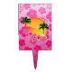 Surfing graphic with surfboard, palm trees, pink hibiscus flowers, and sunset. With a pink background of Honu sea turtles and Hibiscus flowers.
