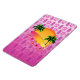 Surfing graphic with surfboard, palm trees, pink hibiscus flowers, and sunset. With a pink background of Hawaiian Honu Sea Turtles and Tiki masks.