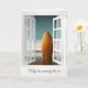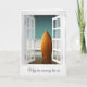 Open white window with sheer curtains and upright wooden surfboard in beach sand for general sympathy.