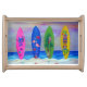 Colorful surfboards on a beach sunset background coastal tropica home party wood serving tray.