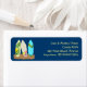 Surfboards return address labels with custom text templates. Yellow text is printed over dark blue. Three decorated surfboards are stuck in the sand at the edge of these custom labels.