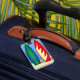 Luggage tag for a surfer with cool design of two brightly coloured surfboards standing on a beach. These surfboards are retro classic style and reminiscent of a bright Summer, sunny day at the beach. A great design for lovers of the beach and of surfing. Perfect for travelling with your surfboard !