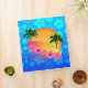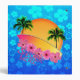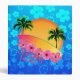 Surfer girl with surf board, palm trees, sunset, and hibiscus flowers. With a ocean blue background with Hawaiian Honu Sea Turtles and Hibiscus flowers.